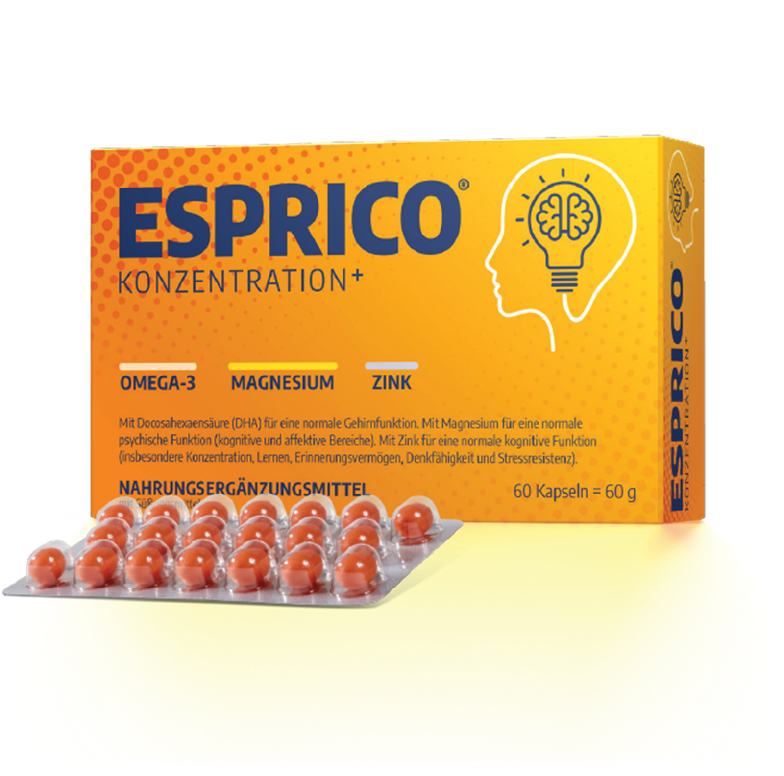 Esprico е додаток во исхрана кој содржи есенцијални масни киселини, цинк и магнезиум, кои се неопходни за одржување на нормалната функција на мозокот. Доаѓа во форма на овошна капсула за џвакање.