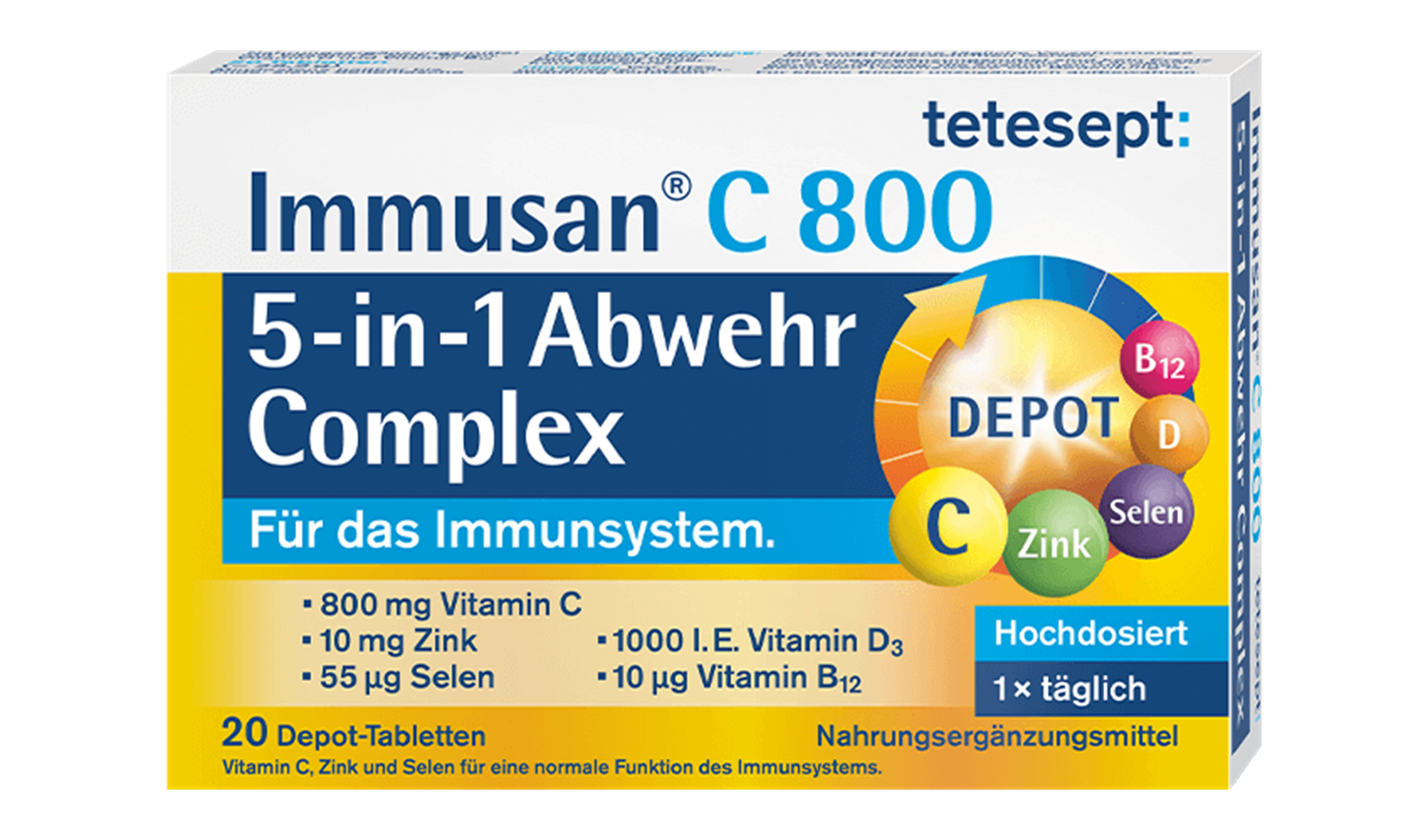 Immusan C 800 5 во 1, депо таблети со цинк, селен и витамини Б12, Ц и Д, наменети за зајакнување на имунитетот. Депо таблетите Immusan C 800 5 во 1 овозможуваат рамномерно ослободување на активните состојки во телото во текот на денот.
