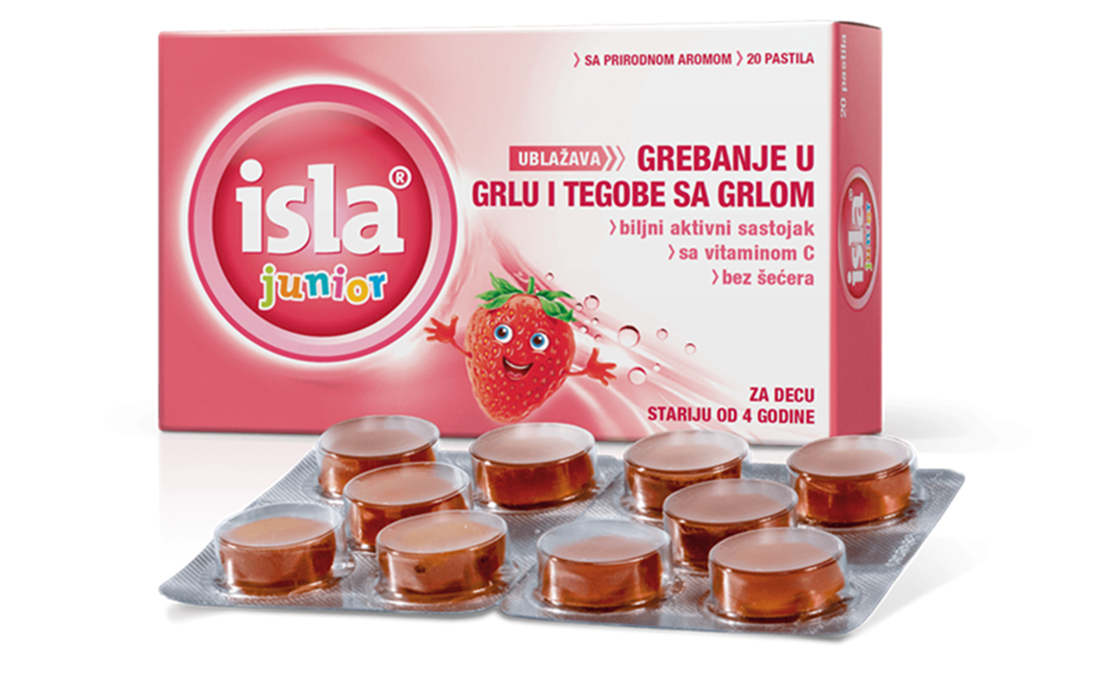 isla® junior пастили против болкa во грлото предизвиканa од настинкa и против сува, иритирачка кашлица. За деца од 4 години и постари. Со пријатна арома на јагода. Без шеќер.