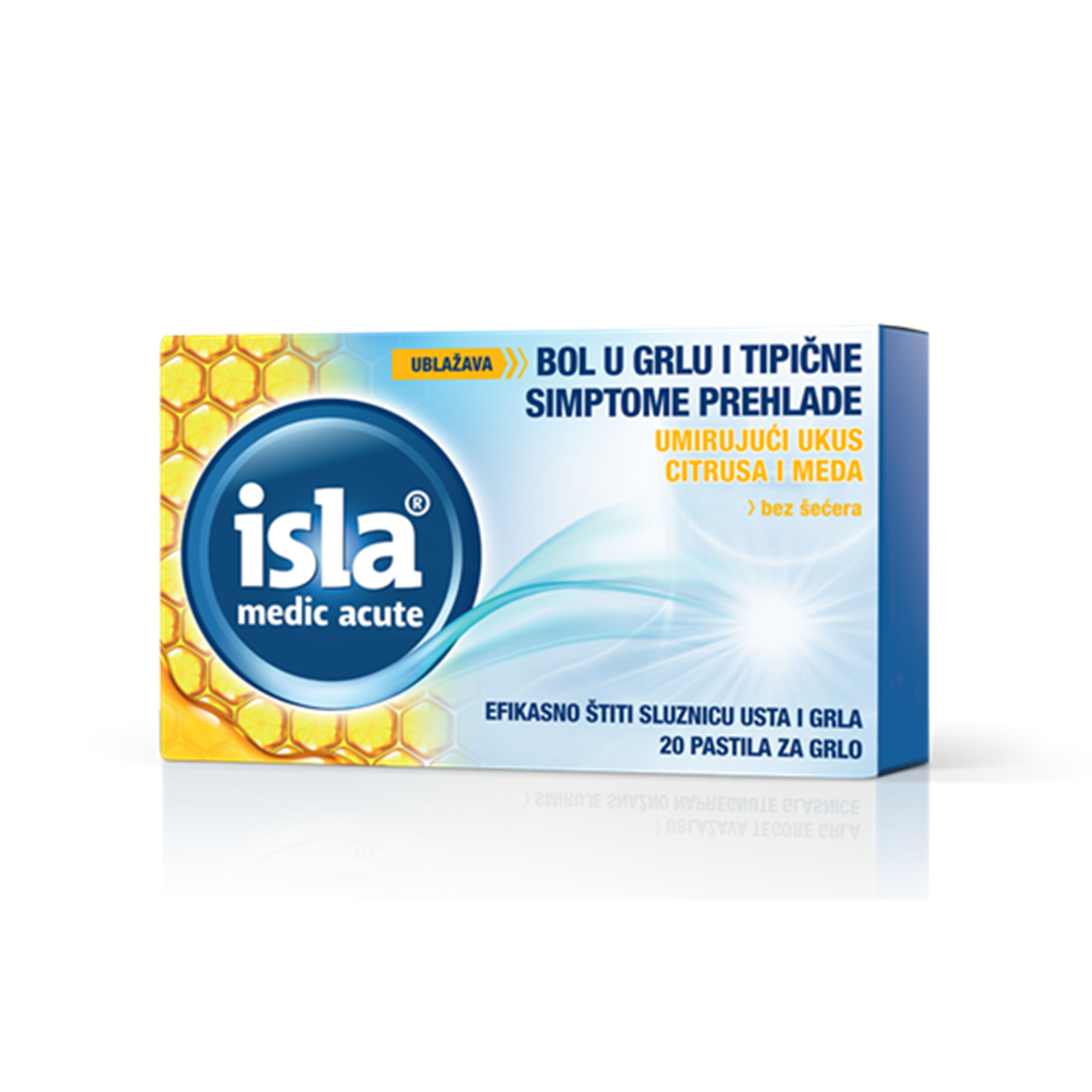isla® medic acute пастилите за акутно грло се вистинското решение за вас, со смирувачки вкус на цитрус и мед. Без шеќер.