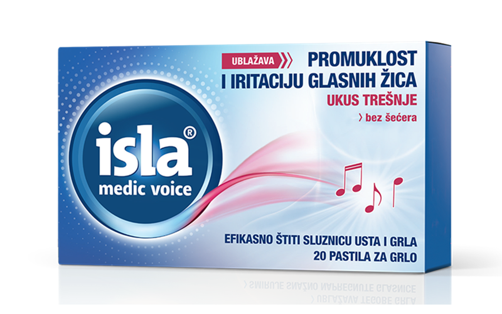 isla® medic voice пастили со хидрогел комплекс кој се состои од хијалуронска киселина и екстракт од исландски лишаи ефикасно ја штитат слузницата на устата и грлото со формирање на заштитен филм која ја обложува иритираната слузница.